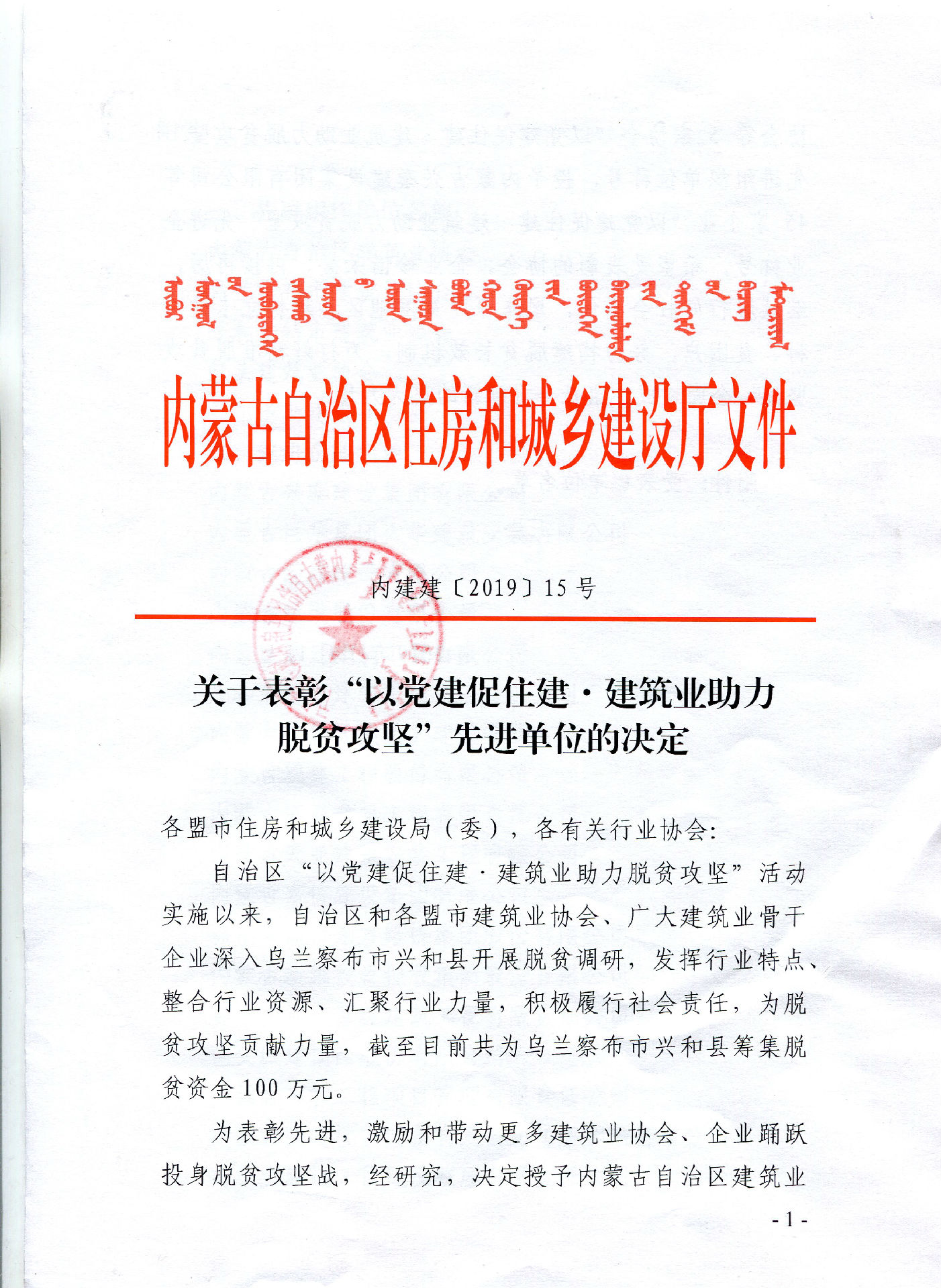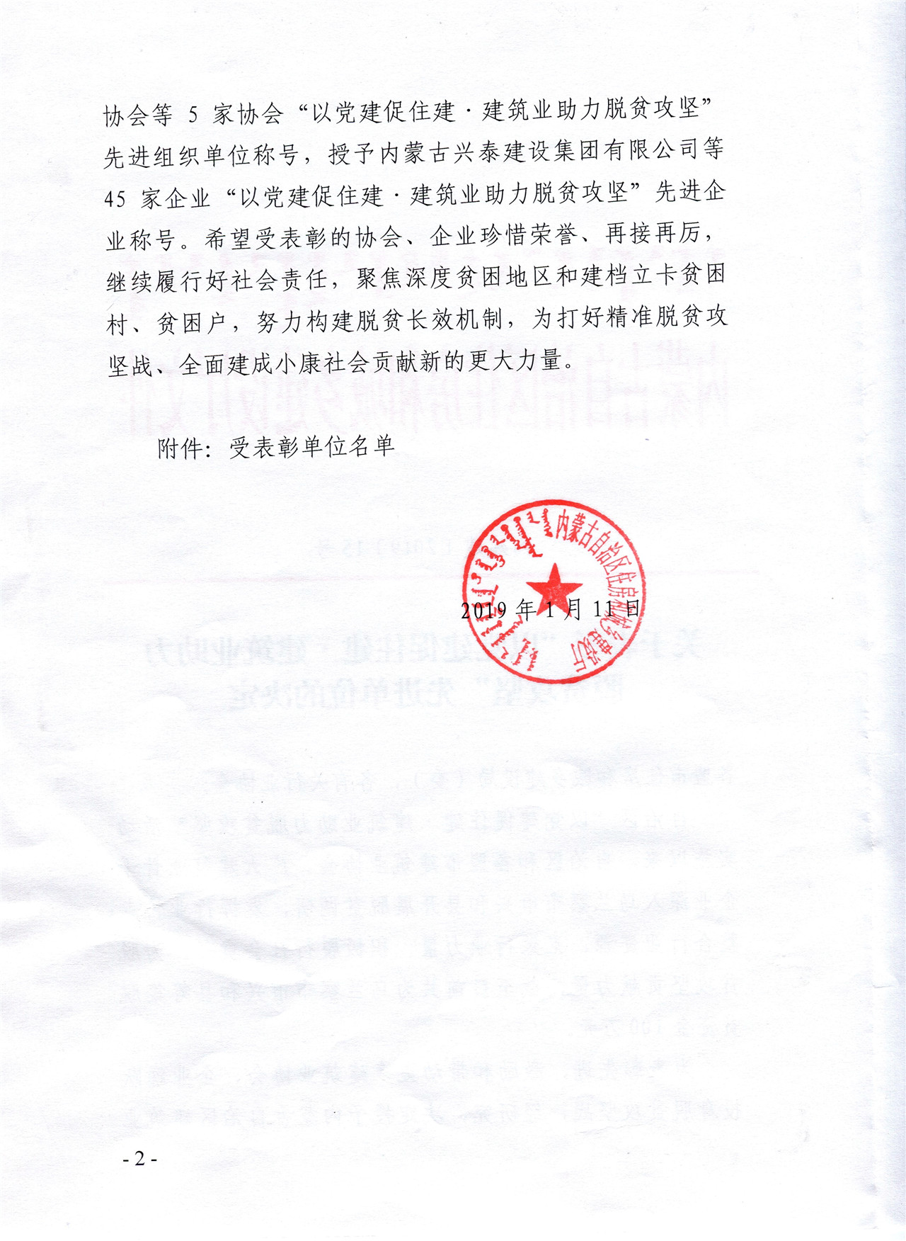內蒙古巨華集團大華建筑安裝有限公司被授予“以黨建促住建,建筑業助力脫貧攻堅”先進單位
